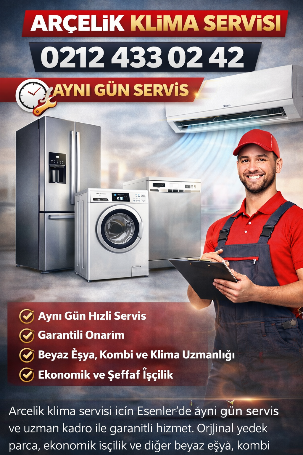 Esenler ve çevresinde yaz aylarının vazgeçilmezi olan klimalarınızın sağlıklı çalışması, hem ev hem de iş yerlerinizde konforun devam etmesi açısından hayati öneme sahiptir. Arçelik Klima Servisi 0212 433 02 42, hızlı, güvenilir ve profesyonel klima teknik desteği ile öne çıkar. Bölgeye özel servis organizasyonu sayesinde arızalar tespit edilir ve aynı gün servis avantajıyla kısa sürede müdahale edilir. Uzman kadro, garantili hizmet ve orijinal yedek parça kullanımı ile klima sistemlerinizin uzun ömürlü çalışmasını sağlar.