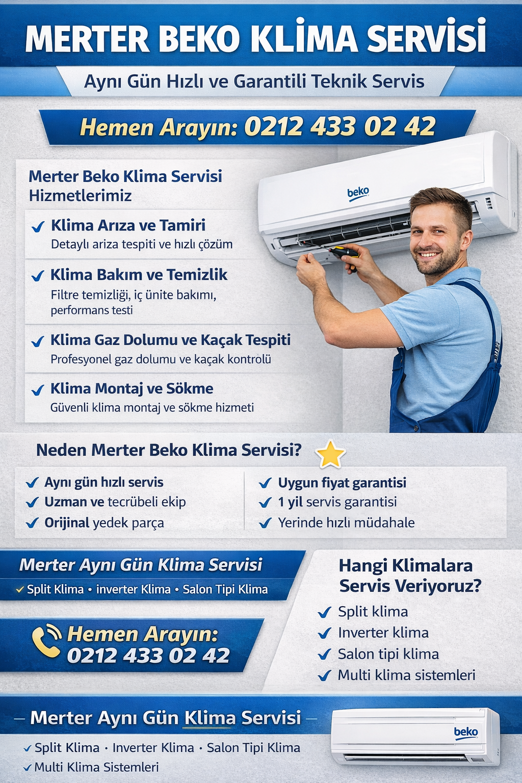 MERTER BEKO KLİMA SERVİSİ Aynı Gün Hızlı ve Garantili Teknik Servis Merter Beko klima servisi olarak, klima arızalarınıza hızlı, etkili ve kalıcı çözümler sunuyoruz. Özellikle yaz aylarında klima arızaları ciddi konfor kaybına neden olur. Bu nedenle deneyimli teknik ekibimizle aynı gün servis Read More